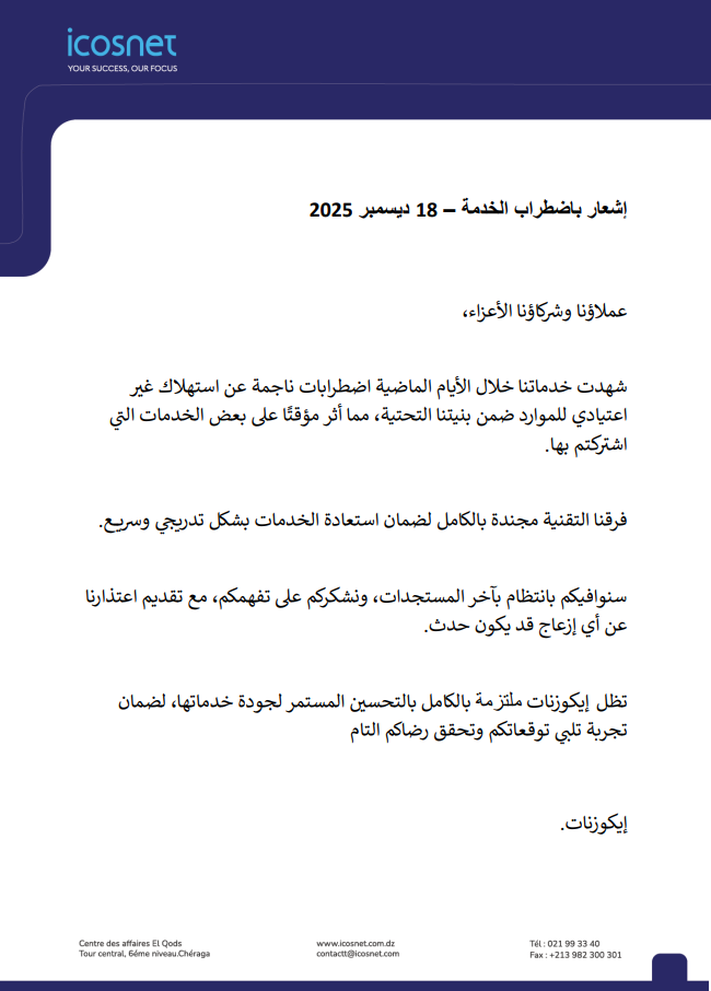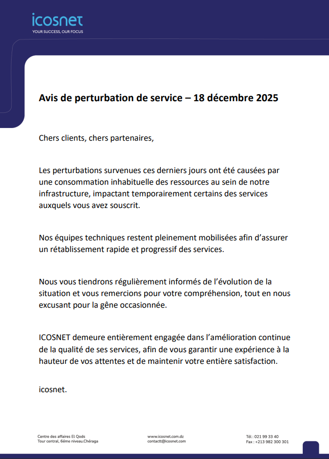 Avis de perturbation temporaire des services – 18 décembre 2025